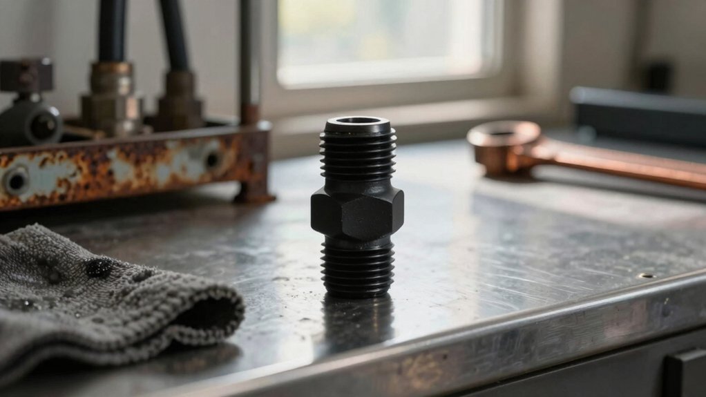 Choosing the right material for your 1/4‑inch hydraulic hose fitting is essential because the material must sustain the system’s maximum working pressure without deforming. Pick carbon steel, alloy steel, or zinc‑plated steel that meets or exceeds the peak pressure—typically 3,000 psi–5,000 psi for JIC fittings and up to 10,000 psi for high‑pressure NPT couplers. Verify the pressure rating surpasses your system’s highest demand; a hardened #45 steel fitting, for example, handles up to 10,000 psi. Opt for corrosion‑resistant finishes like zinc plating or chrome coating to preserve strength in wet environments. Guarantee wall thickness and diameter are adequate; most 1/4″ fittings feature a 0.25″ wall thickness, providing the necessary tensile strength for your pressure class.