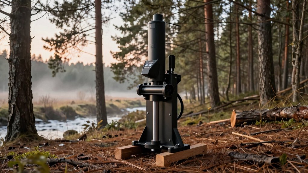 Because a log splitter can generate dangerous forces in an instant, you’ll want a system that forces you to use both hands before the ram moves, an emergency stop that cuts power instantly, and sturdy shields that keep splintered wood away from your fingers. Look for a two‑handed activation lever that won’t engage unless both hands are on the controls, preventing accidental starts. Choose a model with an integrated emergency‑stop button or pull‑cord that instantly cuts hydraulic pressure and motor power. Verify that safety shields or guards encircle the wedge and ram to contain splinters. A pressure‑release valve should automatically depressurize after each split, and a low‑center‑of‑gravity base or anti‑tip brackets will keep the unit stable and reduce tipping risk.
